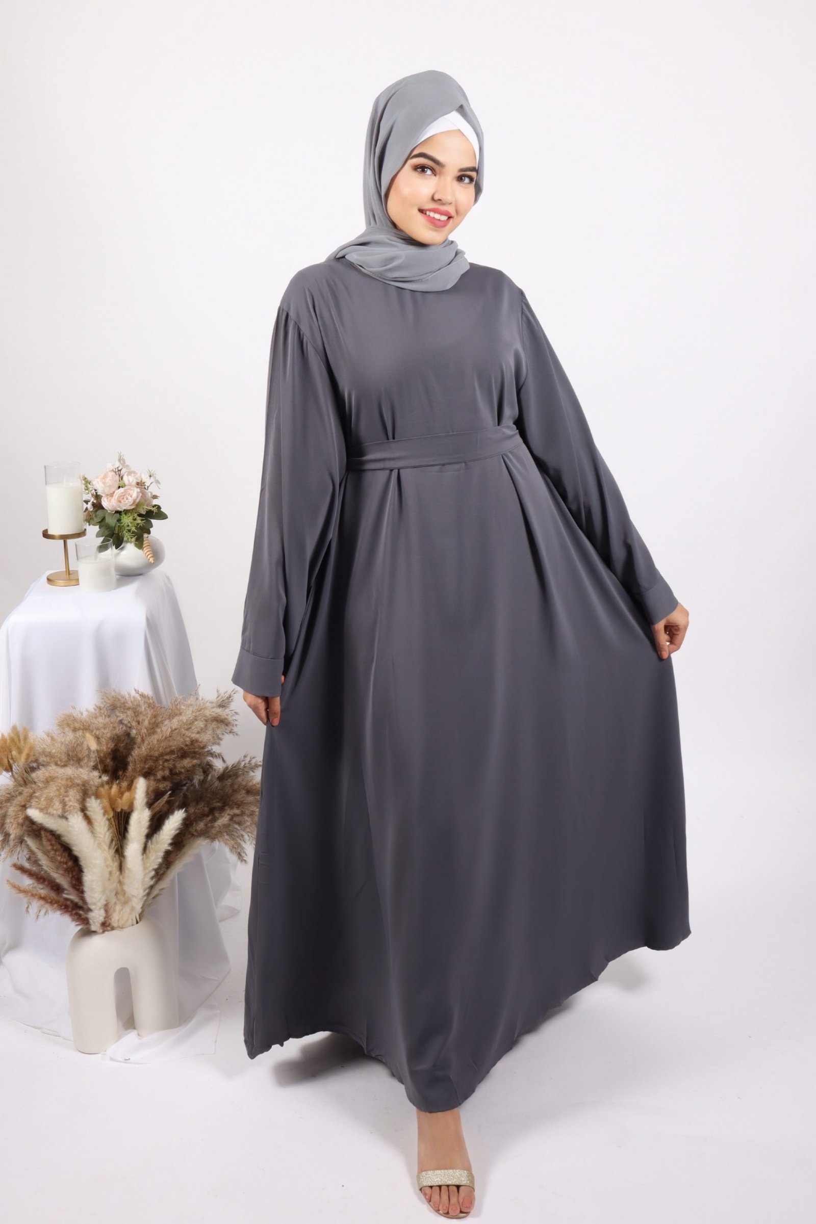 A timeless classic, the Eve Modest Wear Abaya Dress in grey color is a must have in every hijabi’s wardrobe! An essential basic abaya, this piece is perfect for just about any occasion. Made of premium Nida fabric, the abaya flows effortlessly, moving with you, when you step out to conquer the day! It comes with a matching tie belt!