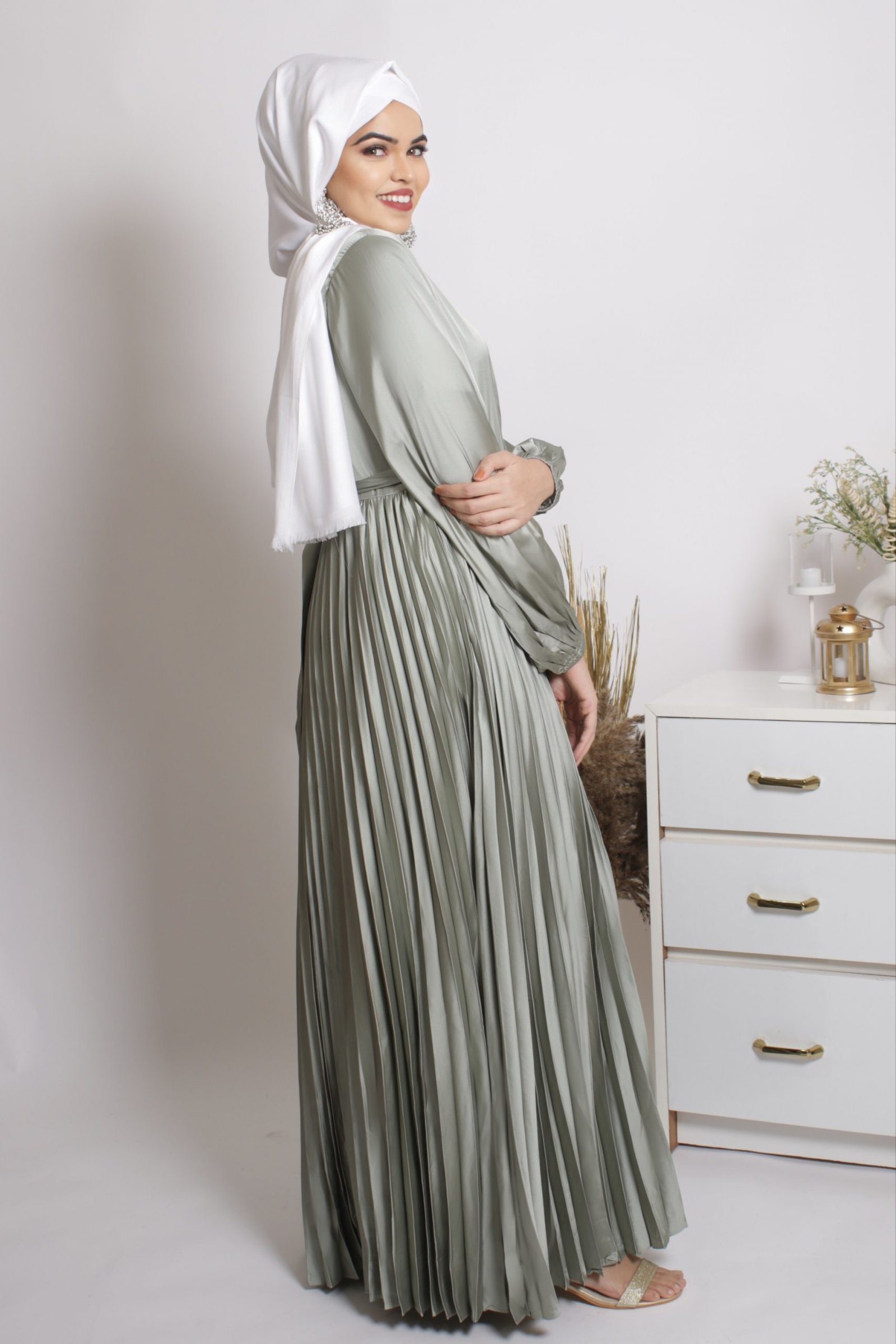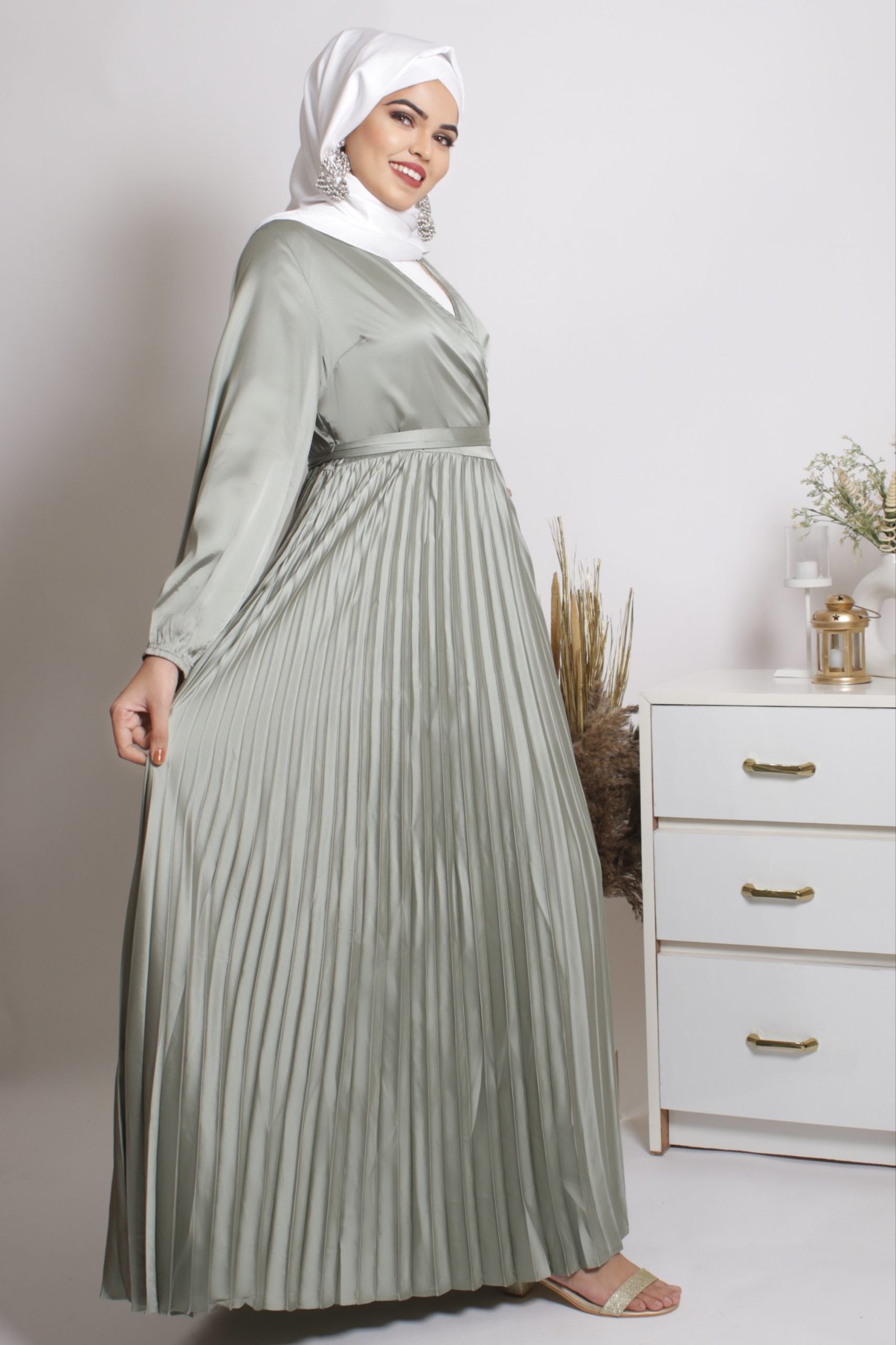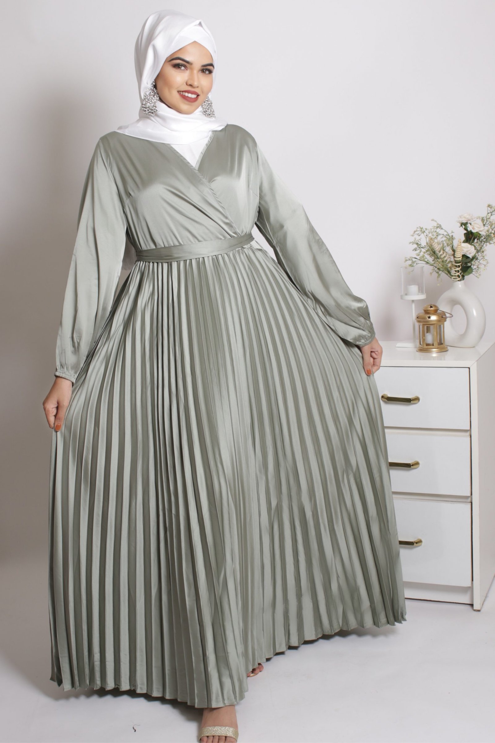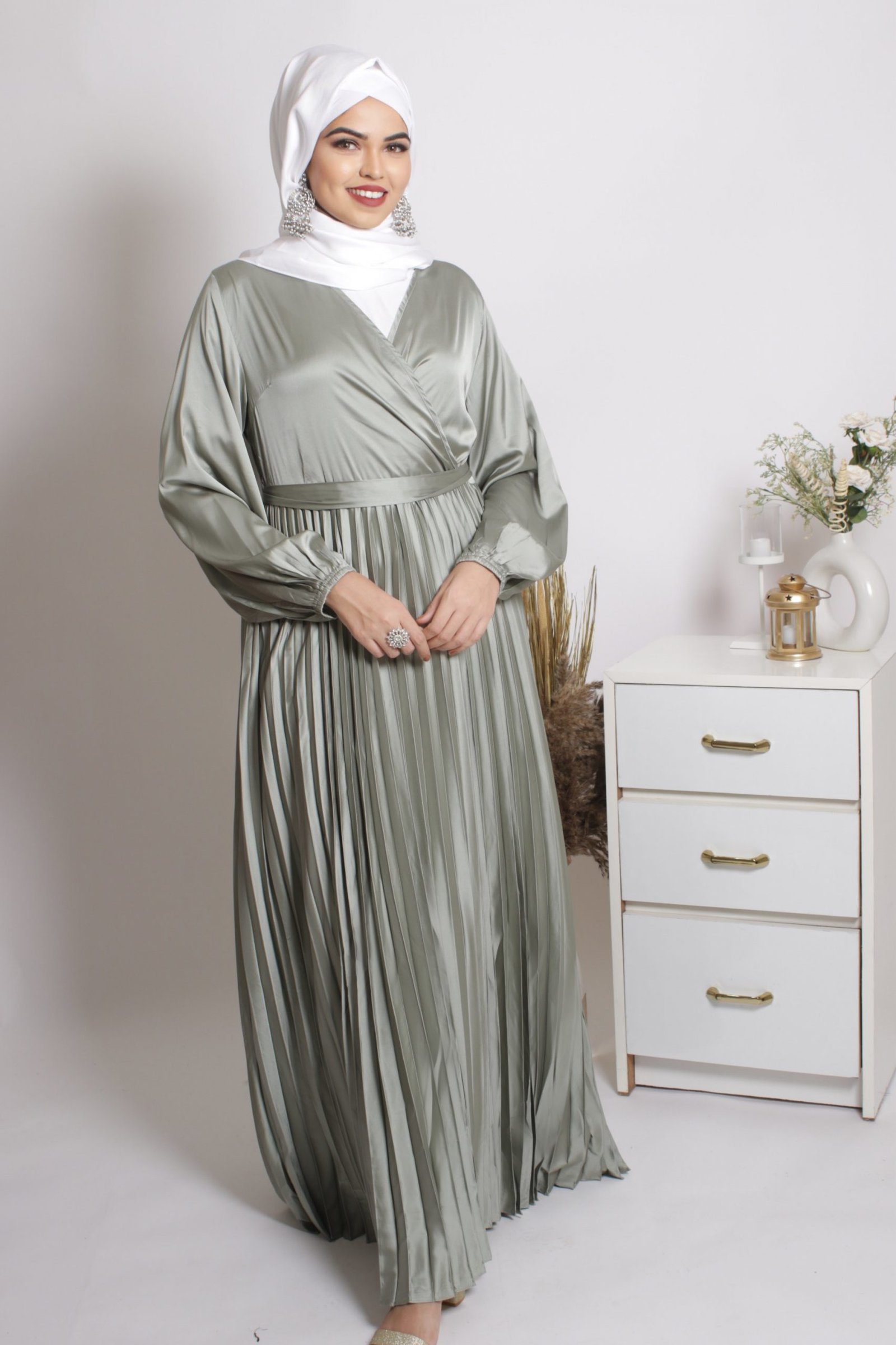 [vc_row][vc_column][vc_column_text]Step into this dress, and step out like a princess! The Feroza Satin Pleated Modest Wear Abaya Dress is a picture of elegance, making it the perfect wedding abaya. The flowy, shiny satin fabric gives it an unmatched feeling of royalty, while the pleated skirt adds a layer of sophistication to this piece. With a wrap around top, wear a covered inner for a more modest look. You can also pair it with earrings or other accessories and get party ready in no time. The satin abaya comes with a matching satin belt to complete the look.