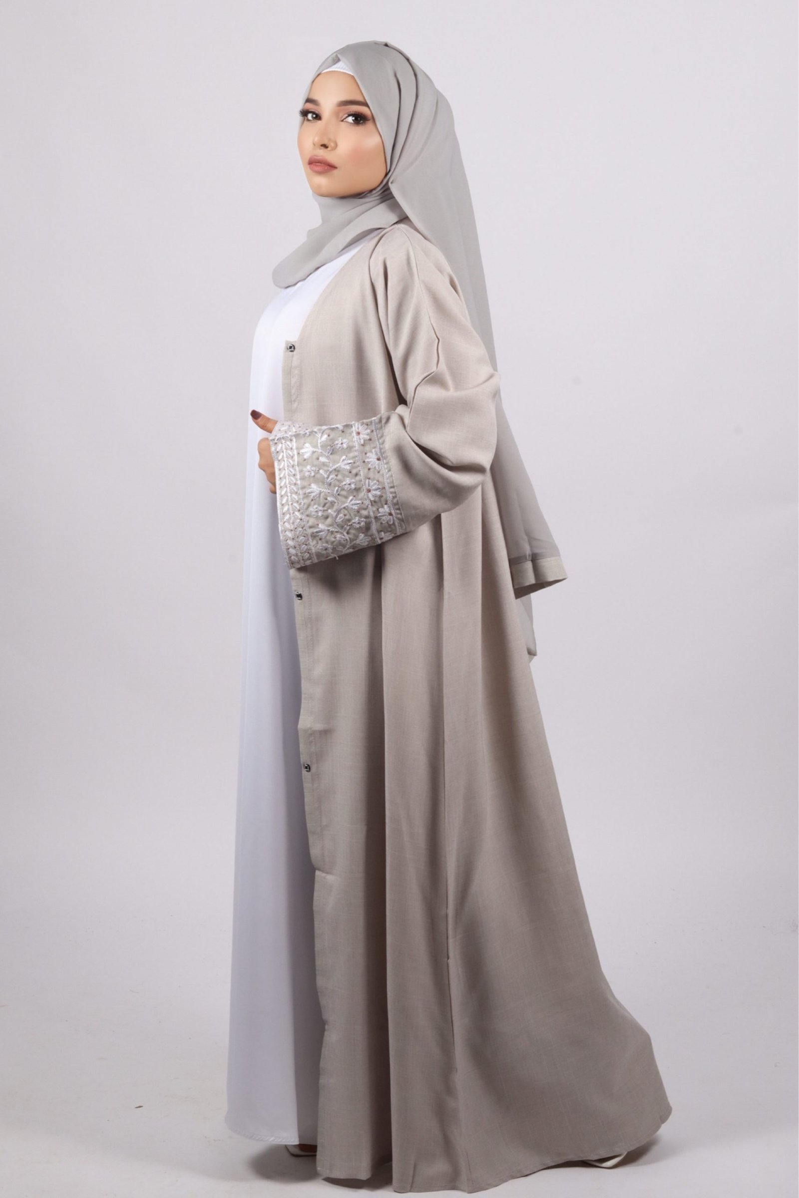 [vc_row][vc_column][vc_column_text]Haseen Embroidered Linen Open Abaya – Silver Ash is every bit as beautiful as its name! Crafted out of exquisite linen fabric with intricate detailed embroidery on flared sleeves to complete it, the abaya is a modest masterpiece in its own right. The high-quality linen fabric used keeps you cool and classy, so you can feel and look? your best, all-day. With a buttoned front, you can wear it either as a closed or open abaya as per your preference. Comes with a complimentary hijab.