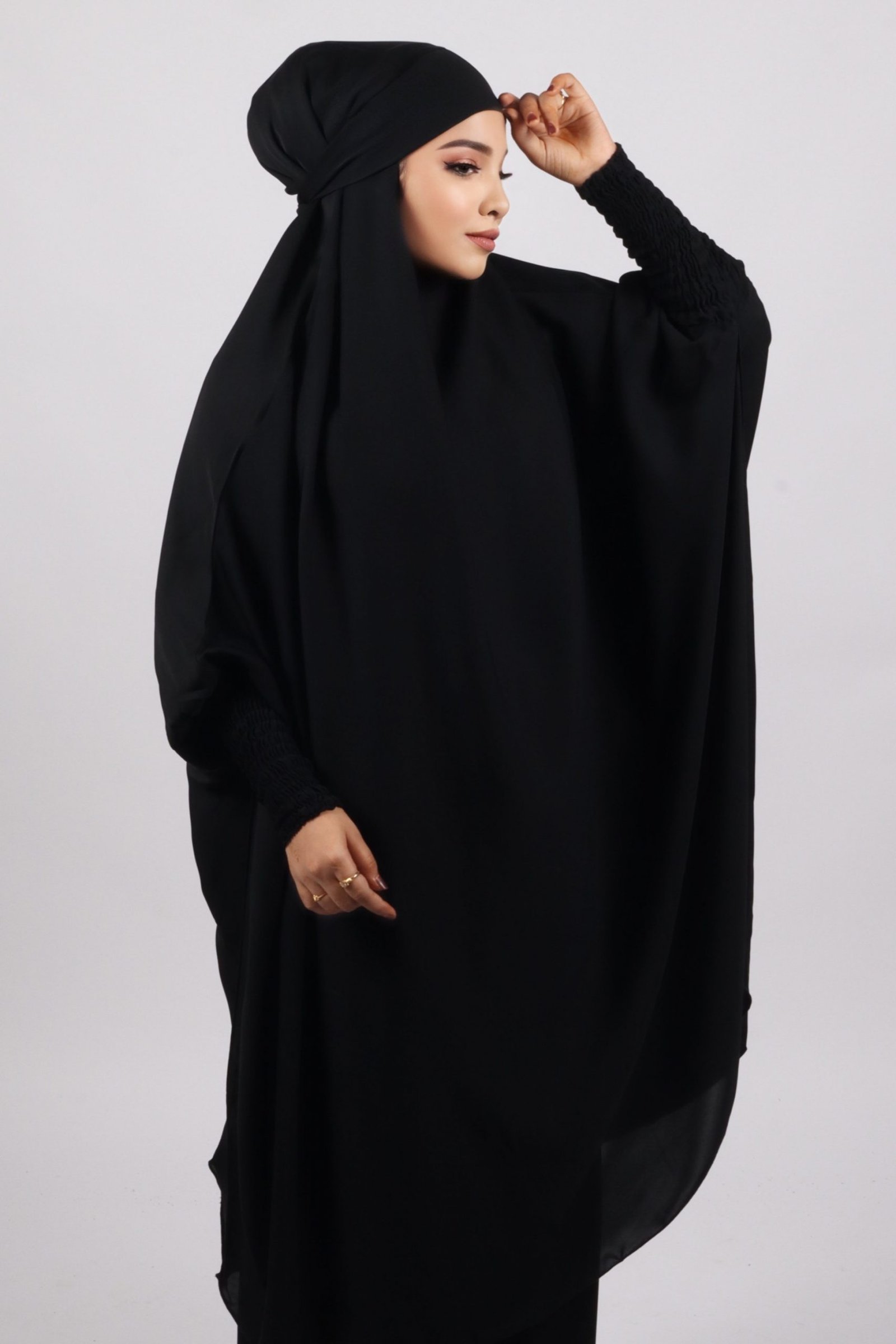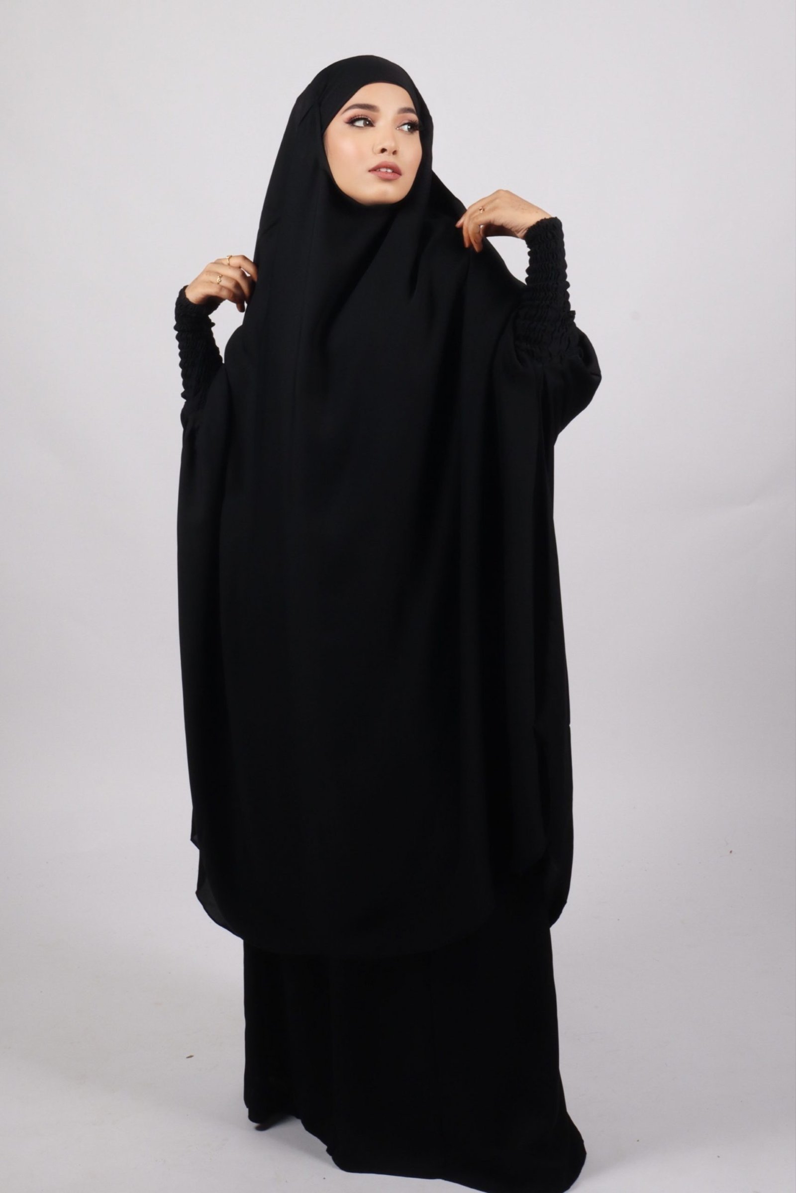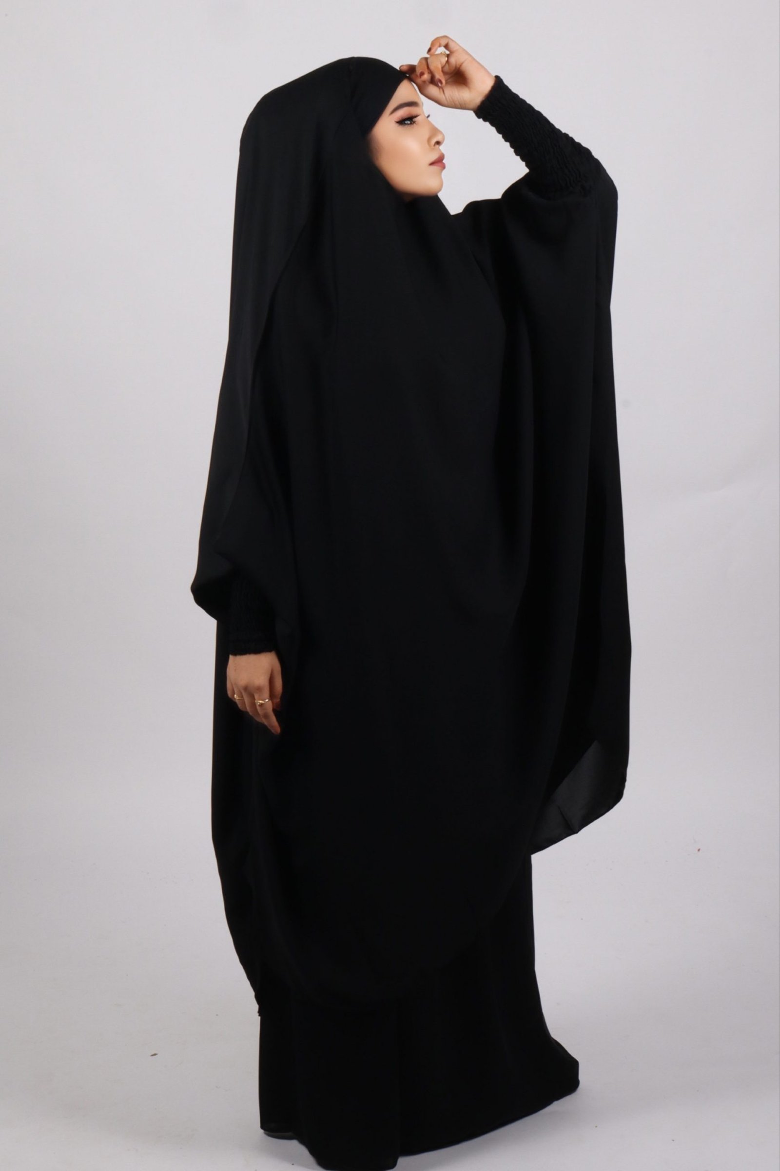 [vc_row][vc_column][vc_column_text]The Haya Jilbab 3-piece Set Midnight Black has a flowing silhouette, wudhu-friendly elastic sleeves, adjustable head tie and impeccable tailoring designed to provide both modesty and style. Made from premium Nida fabric, renowned for its softness and durability, it drapes gracefully, ensuring maximum comfort throughout the day.