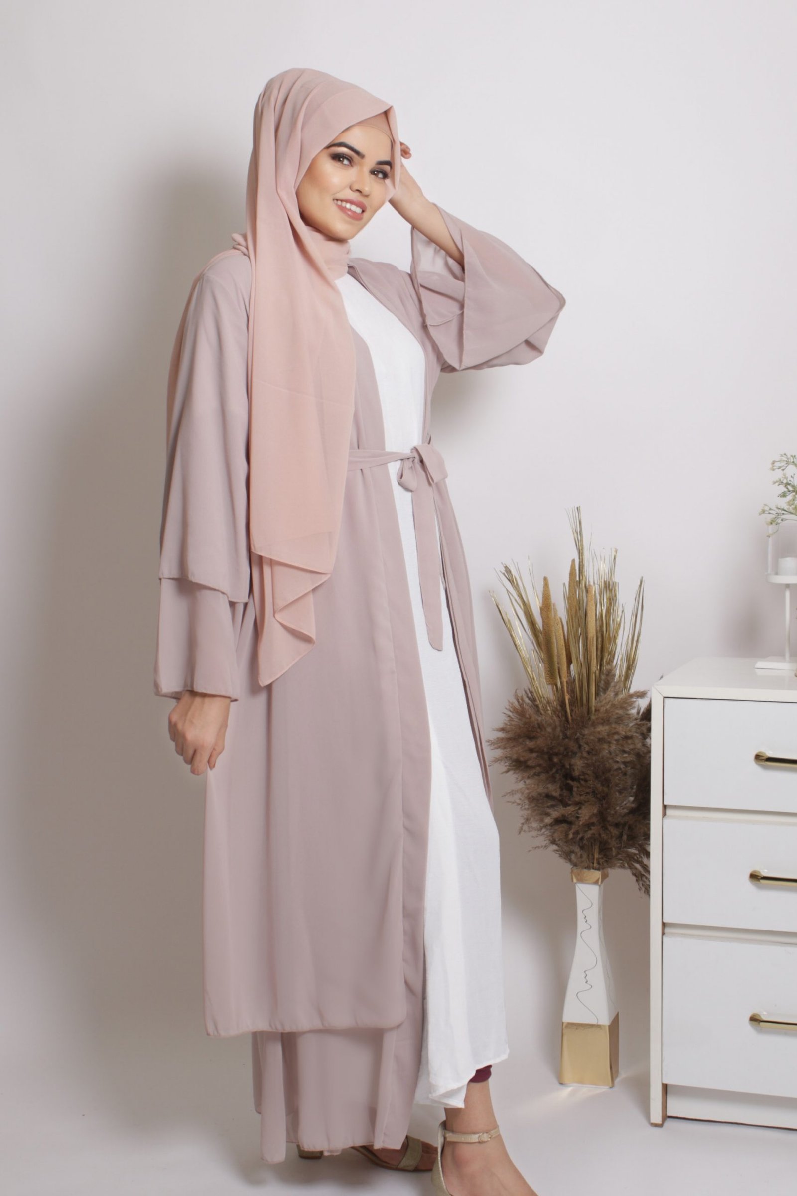 [vc_row][vc_column][vc_column_text]Open abaya now gets the ultimate makeover – the Zara Double Layer Open Abaya Dress is our all-time trending design, that looks super cute, while looking extremely sophisticated. With layered bell sleeves, coupled with a layered bottom, the flowy, lightweight chiffon fabric make of the piece give it a ‘fairy-like’ vibe. The abaya burqa comes with a matching tie belt that you can use for a more polished look, or you can leave it open for a more casual style. Team it up with other abaya’s to reimagine the possibilities of modest fashion!